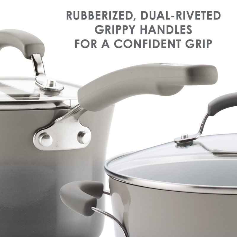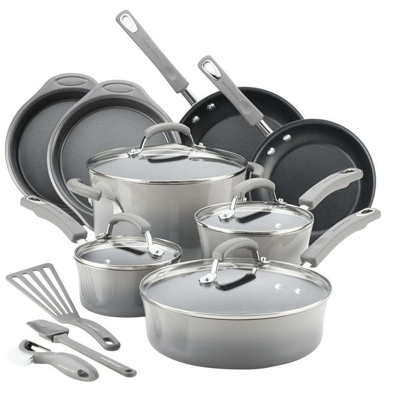 Cooks new and experienced alike will appreciate the essential pieces included in the Classic Brights Hard Enamel Nonstick 15-Piece Cookware Set with bakeware and kitchen tools. Whether your cooking tasks are simmering and searing or browning and baking, cookware gets the kitchen set. From the reliable cooking performance to the fun, contemporary colors and durable materials, the pots and pans in this collection can handle everyone's favorite dishes, and then some. Sturdy aluminum construction promotes even heating, helping to reduce hot spots that can burn foods, and the bold two-tone enamel cookware exteriors show plenty of stylish kitchen personality. hard enamel cookware features durable nonstick interiors that provide beautiful food release and make cleanup snappy. Oven safe to 350F, the cookware's comfortable grippy handles are double riveted for extra strength, and the shatter-resistant glass lids lock in heat and moisture. The cookware comes with two nonstick round cake pans that sport a solid pop of coordinating color and extra-large handles, and are oven safe to 450F. And the cooking tools included – two nonstick-suitable cooking spoons and Rach's clever Veg-A-Peel fruit and vegetable peeler – are smartly-designed so your cooking really cooks! Make, bake and share favorite foods and show off a lot of personality with the bold and contemporary Classic Brights Hard Enamel Nonstick 15-Piece Cookware Set.Pots and pans feature sturdy aluminum construction for quick, even heating; medium nonstick bakeware made from warp-resistant steelThe cookware set's two-tone exterior color makes a bold style statement; long-lasting nonstick interiors provide easy food release and cleanup