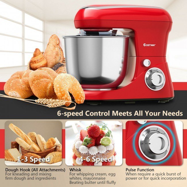 The stand mixer can perfectly deal with all kinds of ingredients ranging from cream and egg whites to heavy dough; serving to let you enjoy everyday cooking. Power motor ensures a more efficient way to mix food; which keeps the freshness and smoothness of food. Six different speeds can meet all your kitchen needs. 3 attachments are available for multi-purpose use; which perfectly do all kinds of food mixing such as cream; knead; beat and whip. On the bottom; four non-slipping pads help to keep the stand mixer stable and steady while working. The stainless steel bowl is equipped with a splash guard to keep the kitchen clean.