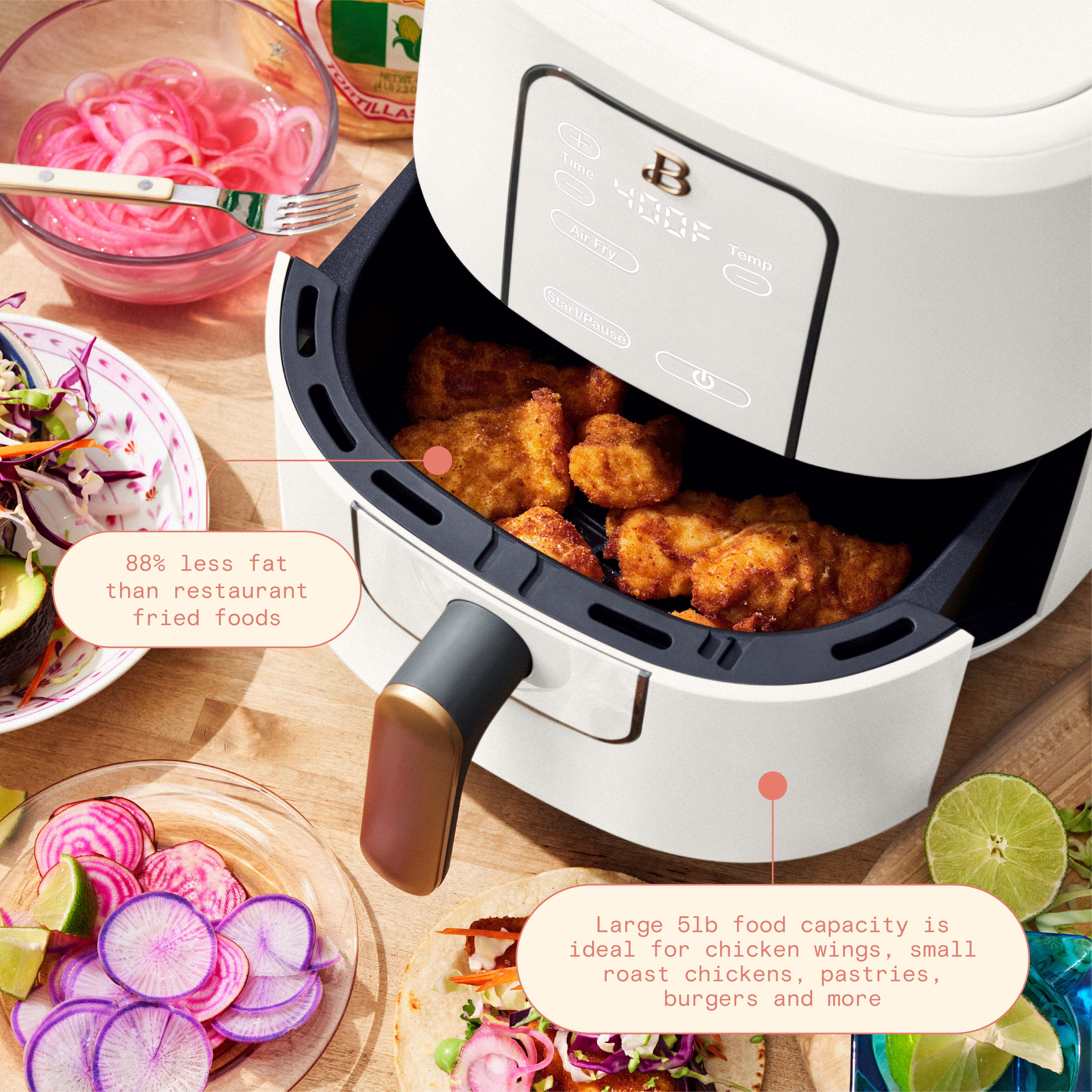 Our signature touch-activated display illuminates only when you need it. No dials, buttons or knobs.Powerful 1700-watt system with stainless steel provides faster heat-up and cool-down times.High Performance Circular Heat Technology and nonstick crisping tray promote fast, crispy, evenly-cooked meals.Large 5lb (2lb French fry) food capacity is ideal for chicken wings, small roast chickens, pastries, burgers and more.Air fried favorites have 88% less fat and 65% fewer calories than restaurant-fried foods.Adjustable temperature ranges from 90°F-400°F to suit a variety of recipes.Air fry, roast, reheat and dehydrate with little-to-no oil needed.Quickly reheat leftovers with crispy, flavorful results.60-minute automatic shut-off function adds safety and peace of mind.Removable crisping tray and pan are dishwasher safe and PFOA/PFOS-free for fast and easy clean-up.Available exclusively at Walmart.