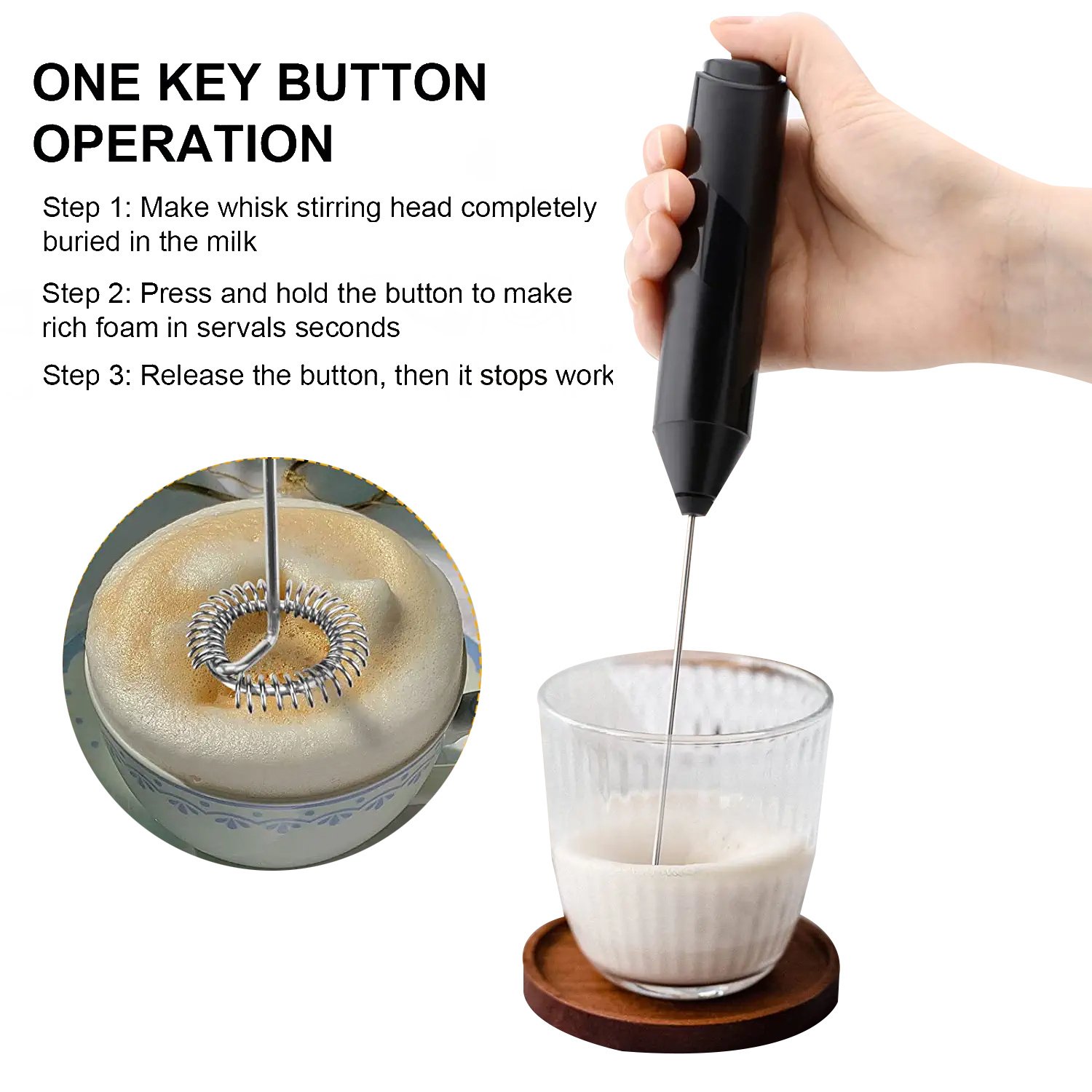 <br>Easy to Use and Clean - Simple one-touch button with a low noise level, just put it into a container with liquid food up to approx 1/3 to froth, and it will stop work upon you loose the button. If you want to clean it, just put the whisk in the water and press the button to spin it clean