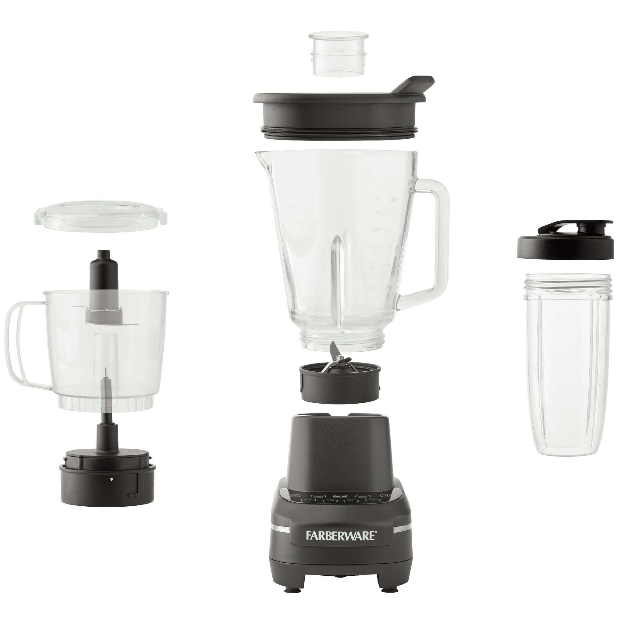 Farberware touching blending system: 1.50 oz. Boron glass blending jar: accommodates large blending needs. 20 oz. Jar: single serve size with travel lid. 4 cup chopper attachment: includes stainless steel blade. Stainless steel attachment: durable and easy to clean. Digital touch panel sensor: the display lights up when ready for use. Vatriable speed blender with 800w watts of power. Handy presets including ice-crushing & smoothie blending. Includes 20 oz travel jar & 4 cup chopper.