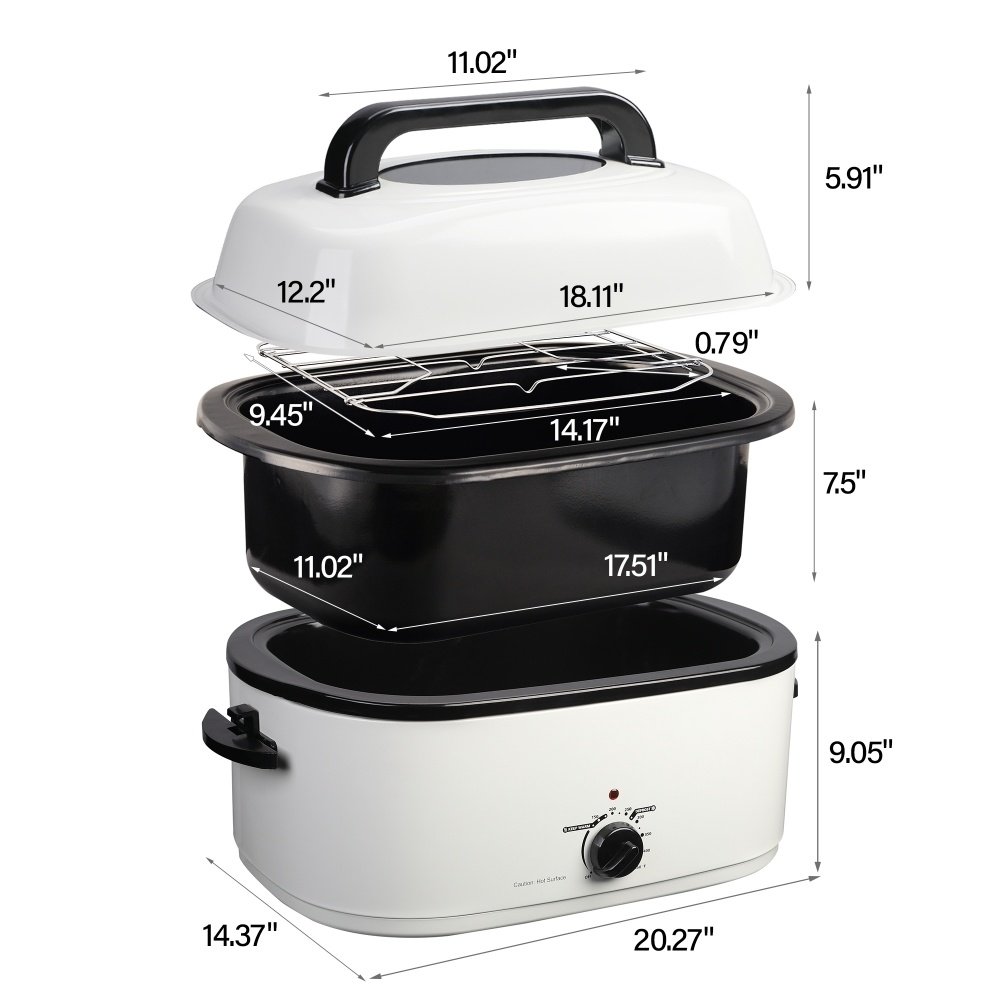 Description:Product Size:The spacious capacity of 22 quarts accommodates turkeys weighing 26 lbs, for holiday gatherings, large family meals, or any occasion that requires cooking large amounts of food.Product Design:Enjoy precise temperature control from 150°F to 450°F, allowing for various cooking functions such as roasting meats(turkeys, chickens, beef), baking, slow cooking, defrosting and keeping food warm. The roaster oven ensures even heating, resulting in consistent doneness throughout the meat. The visible lid allows you to observe the color of turkeys and food without opening it, ensuring minimal temperature and moisture loss.