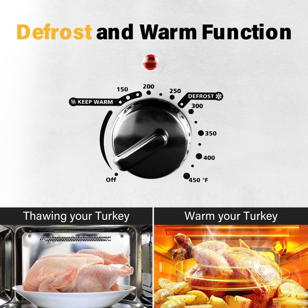 Product Design:Enjoy precise temperature control from 150°F to 450°F, allowing for various cooking functions such as roasting meats(turkeys, chickens, beef), baking, slow cooking, defrosting and keeping food warm.