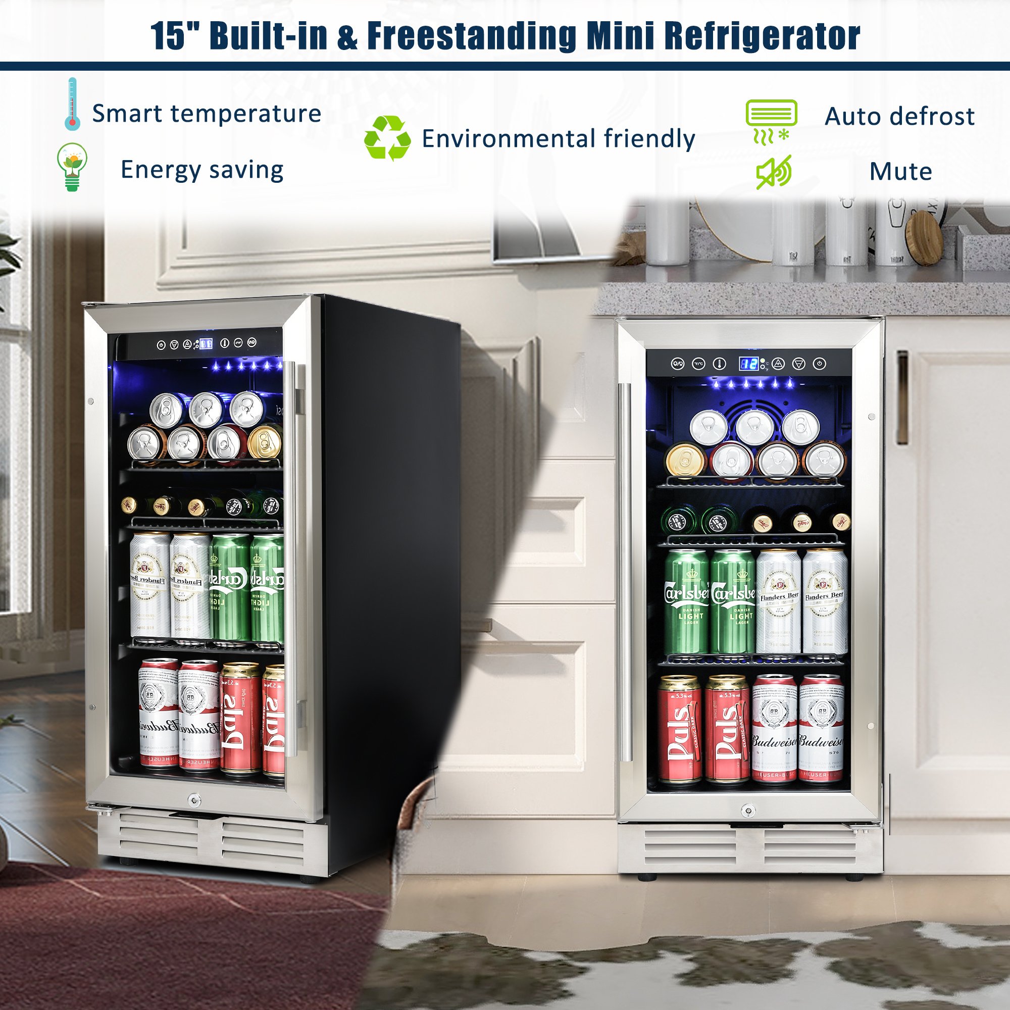 1.1. Versatile Built-in & Freestanding Design: Enjoy cold drinks anytime, anywhere, with this 15-inch mini refrigerator that doubles as a wine cooler. Whether in your living room, kitchen, bar, or office, it seamlessly blends with any furniture setup.