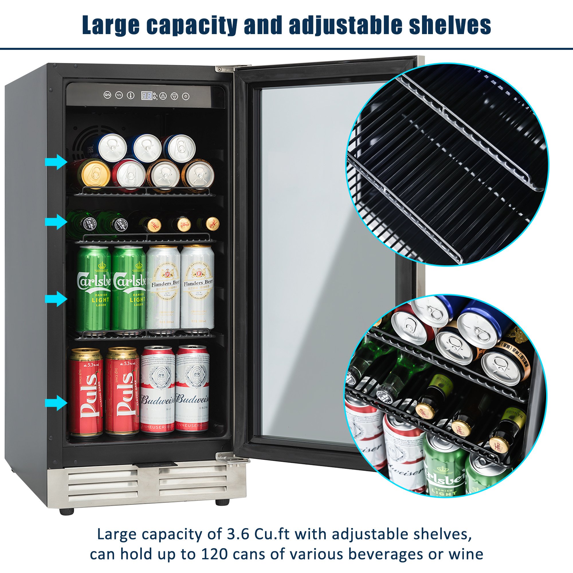 3.3. Spacious & Customizable: With a 3.6 Cu.ft capacity and three adjustable shelves, it accommodates up to 120 beverages of various sizes. From sparkling water and beer to champagne and wine, all your favorite drinks find a perfect spot.