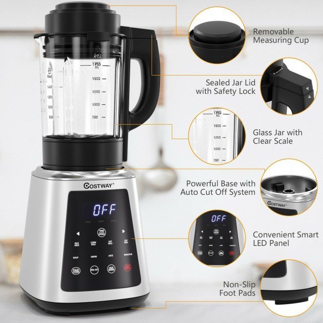 Large capacity pitcher made of food-grade BPA-free material8 pre-set operating programs create a variety of hot & cold drinks1200w blending motor & 800w heating motor for quick making10 variable speeds and processing time for custom control12-hour timer to set the starting time at willLED smart panel & detailed instructions make the adjustment easier6 stainless steel blades ensure delicate blending & grindingAuto cut-off system free your time & energyNon-slip bottom suctions & large base for high stability